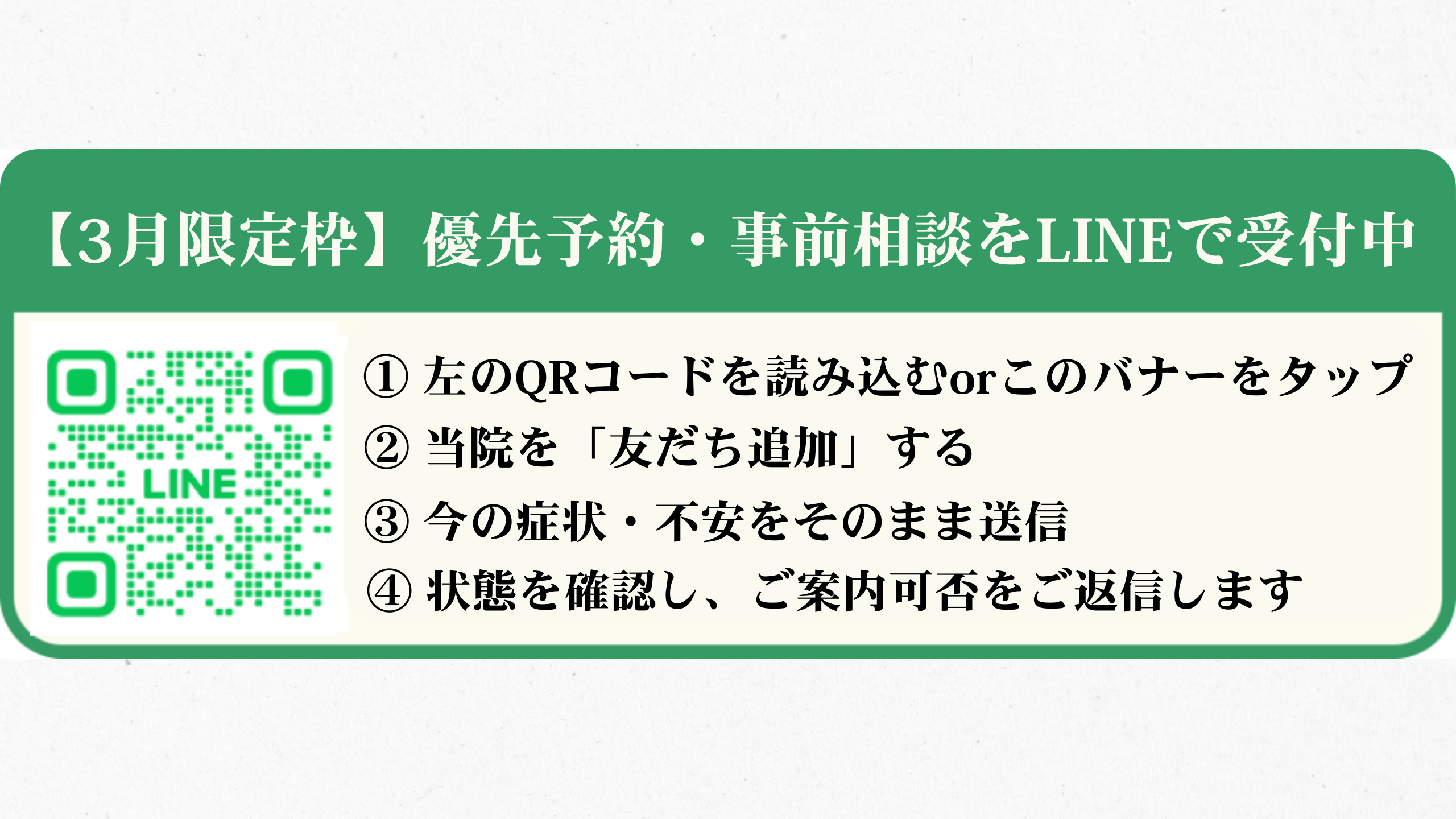 2月の新規受付は定員終了になります。3月・4月の先行予約希望の方はLINEにてお問い合わせください